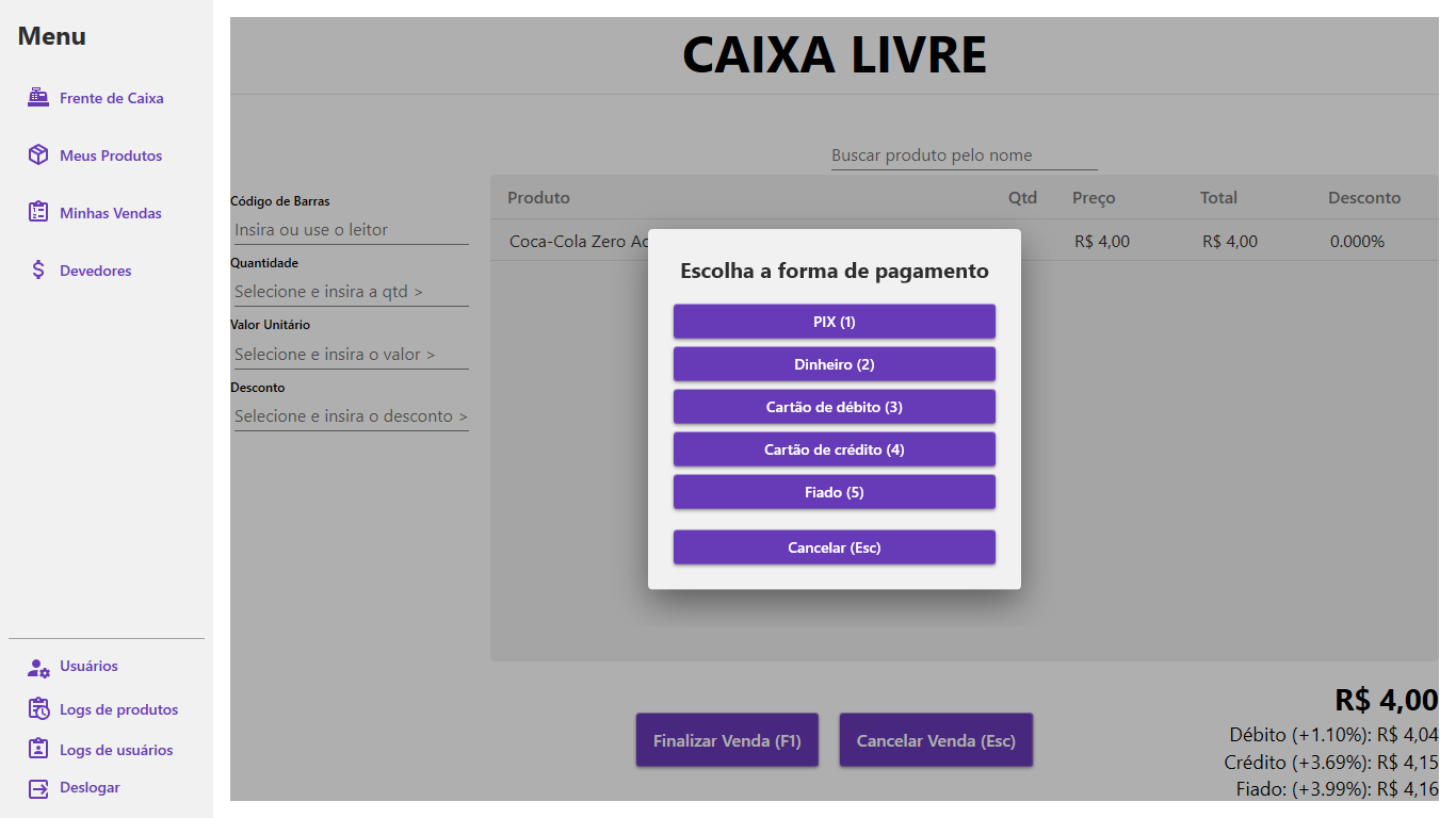 Várias formas de pagamento, incluindo vendas no FIADO.