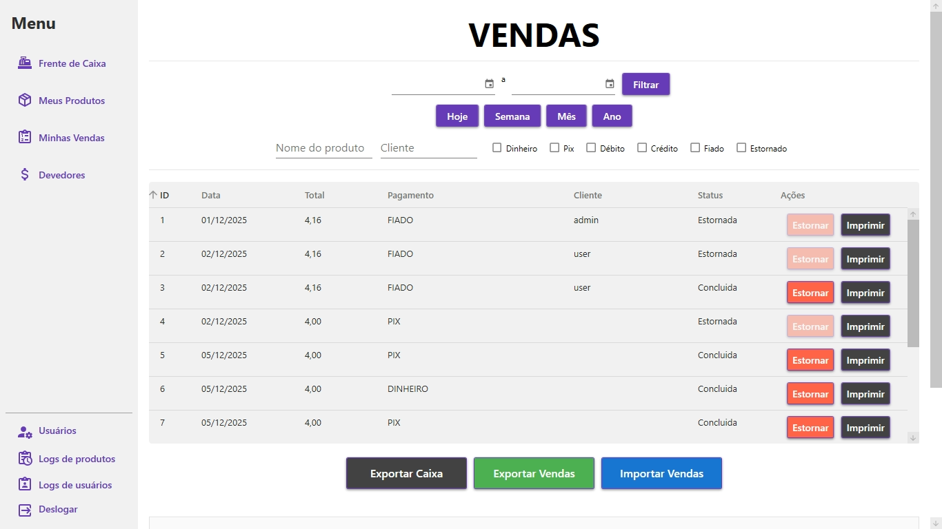 Veja todas as suas vendas feitas ou use filtros para buscar vendas específicas, exporte o caixa do dia, exporte ou importe todas suas vendas em 1 clique, imprima cada venda.